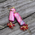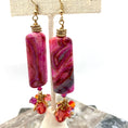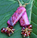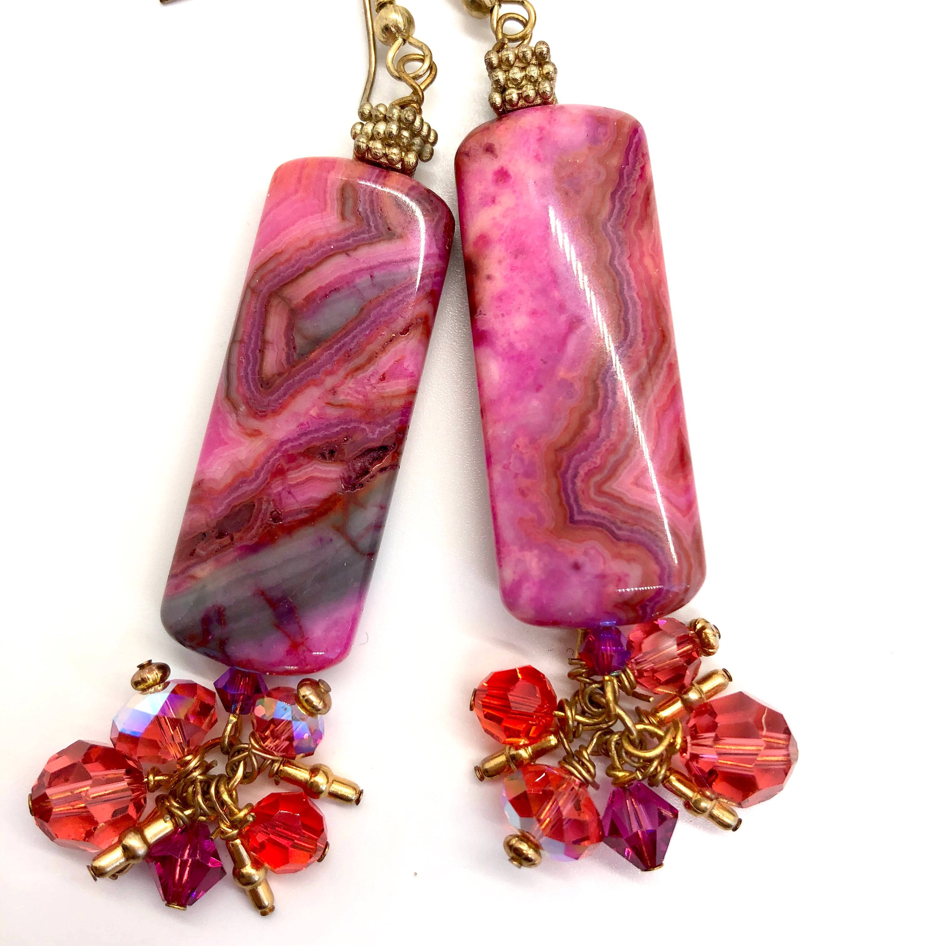 A cluster of tiny gold filled beads, and Siam, magenta, and fuchsia crystals drops from 1.5" slabs of gorgeous crazy lace agate. Ear wire and findings are in a byzantine gold finish. The pair measures 3.25" long