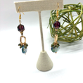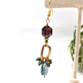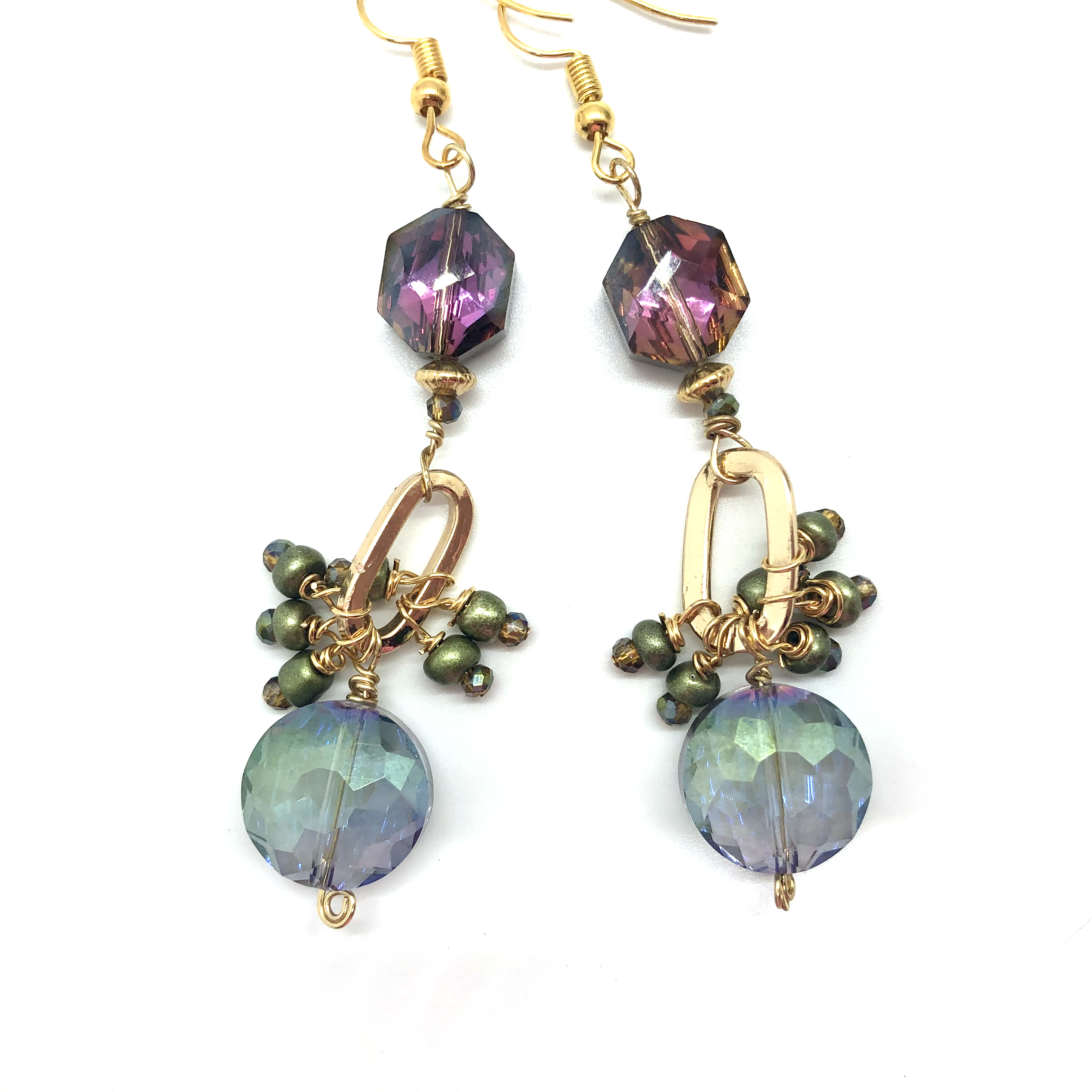 Luscious magenta hexagon cut crystals are connected to AB coated faceted mystic blue coin beads with bold 1/2" yellow gold filled links emblazoned with sage green seed beads.
