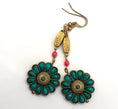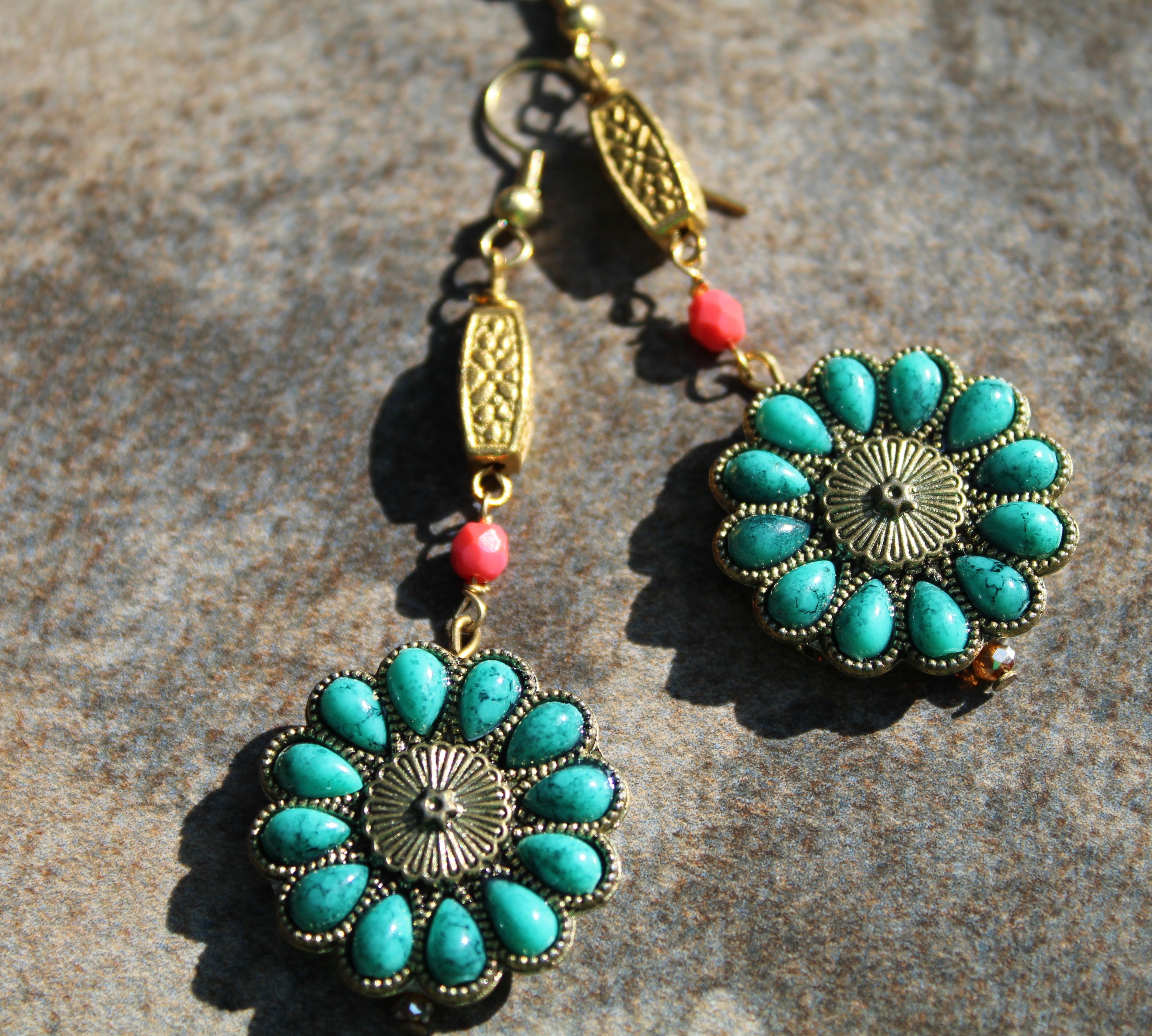 Fun, Boho-chic earrings feature dyed turquoise and a coral colored glass bead for a pop of interest. Hung from a textured, Byzantine gold bead the earrings measure 2.75".