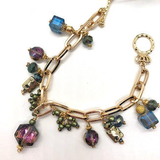 This 8" antique bronze finish toggle bracelet features a handmade chain of clay tiger print beads, Black Matrix Picasso Jasper and tiny bronze cubes connected to a double strand of chain adorned with crystal bronze filigree beads and bronze cube drops.