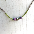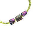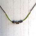 This fully adjustable to 18.5" bar necklace is simplicity at it's finest. Strung between 2 rows of foil lined peridot glass seed beads, the bar is suspended by an antique copper finish cable chain and has a lobster claw clasp.