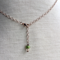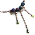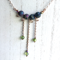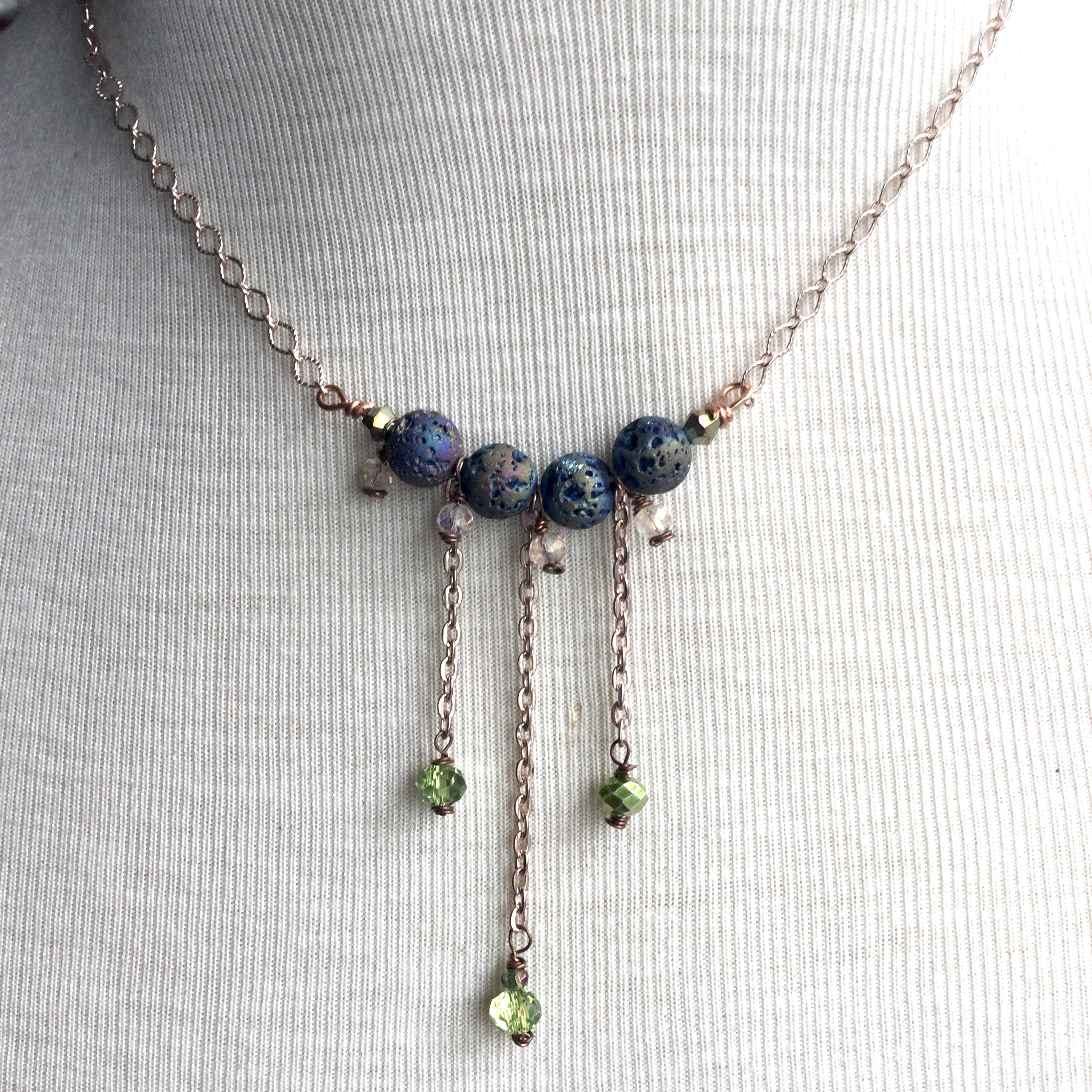 This necklace features a focal point of violet blue iris electroplated lava stones, rose and peridot foiled crystal rondelles integrated in a textured rose gold finished chain The piece is fully adjustable up to 18" and the focal drops another 2.5" at it's longest point.