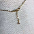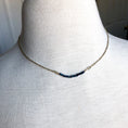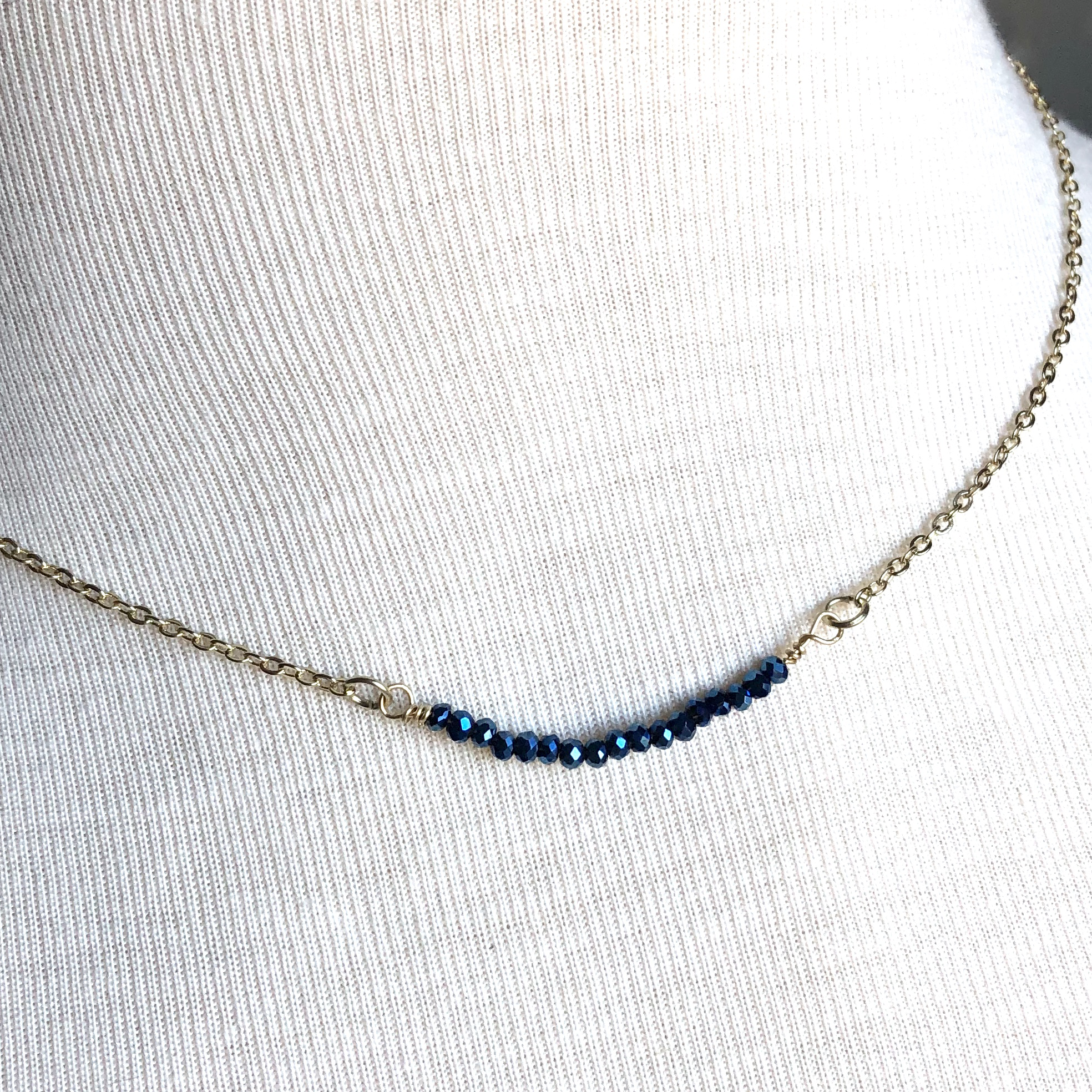 A single 1.5" inch bar of tiny 2mm blue iris lustered sapphire crystals bridges a 16" strand of gold filled micro cable chain. The chain features a 2" extender enhanced by the sweetest little freshwater pearl. Looks great alone or worn with any others in this collection.