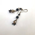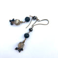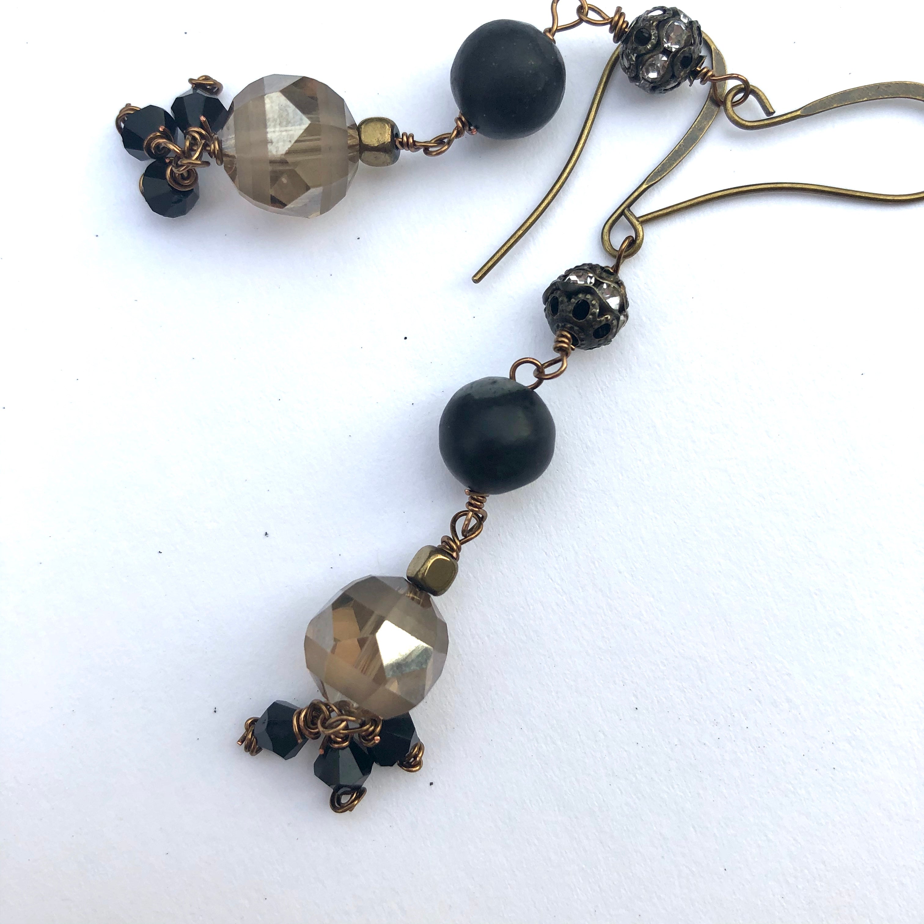 Antique brass drop earrings featuring bronze and crystal filigree bead, a 6mm Picasso Jasper round and a tiered-cut mocha matte banded crystal with black crustal bi-cone tassel. Drops 2.5" from ear wire.