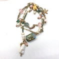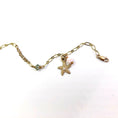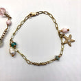 Precious matte gold textured starfish charm with embedded clear crystal is integrated into a delicate gold filled, elongated oval link chain featuring aqua, rose, mermaid green and sand colored crystals and an intricate freshwater pearl drop. Bracelet measures 7.5" and has a lobster closure.