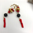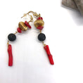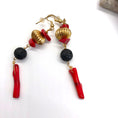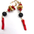 This pair features gold filled corrugated beads embraced by red coral chips finished with 2 top-drilled pieces of red bamboo coral dropping from an 8mm black lava bead.