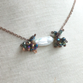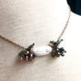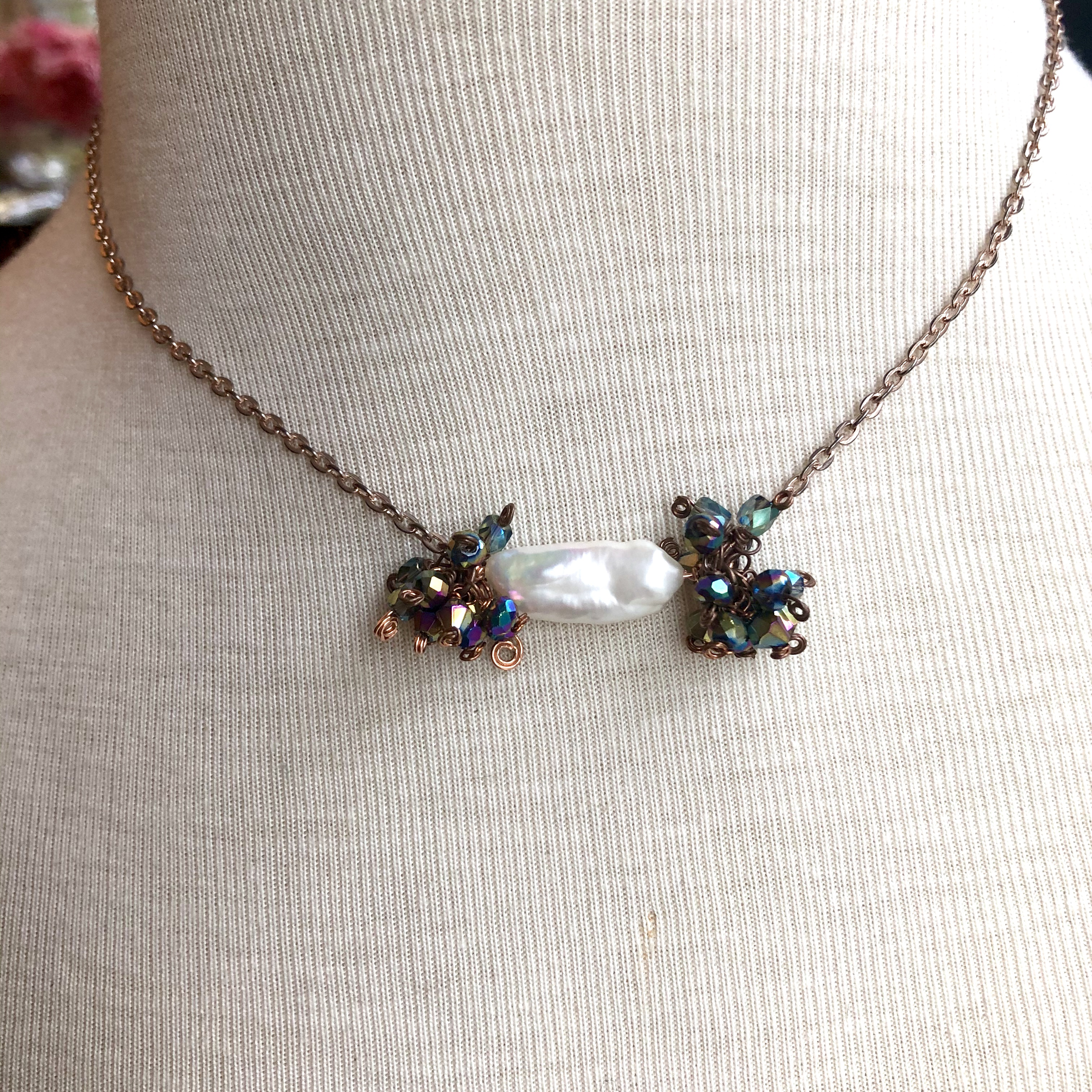 A 3/4" long Biwa Pearl is embraced by 2 luscious clusters of wire wrapped rainbow iris coated crystal bi-cones and luster-coated barrel beads. Stunningly understated, this focal is enhanced by a simple, dainty rose gold plated 16" chain with a 2" extender finished with a lobster claw clasp.