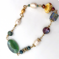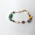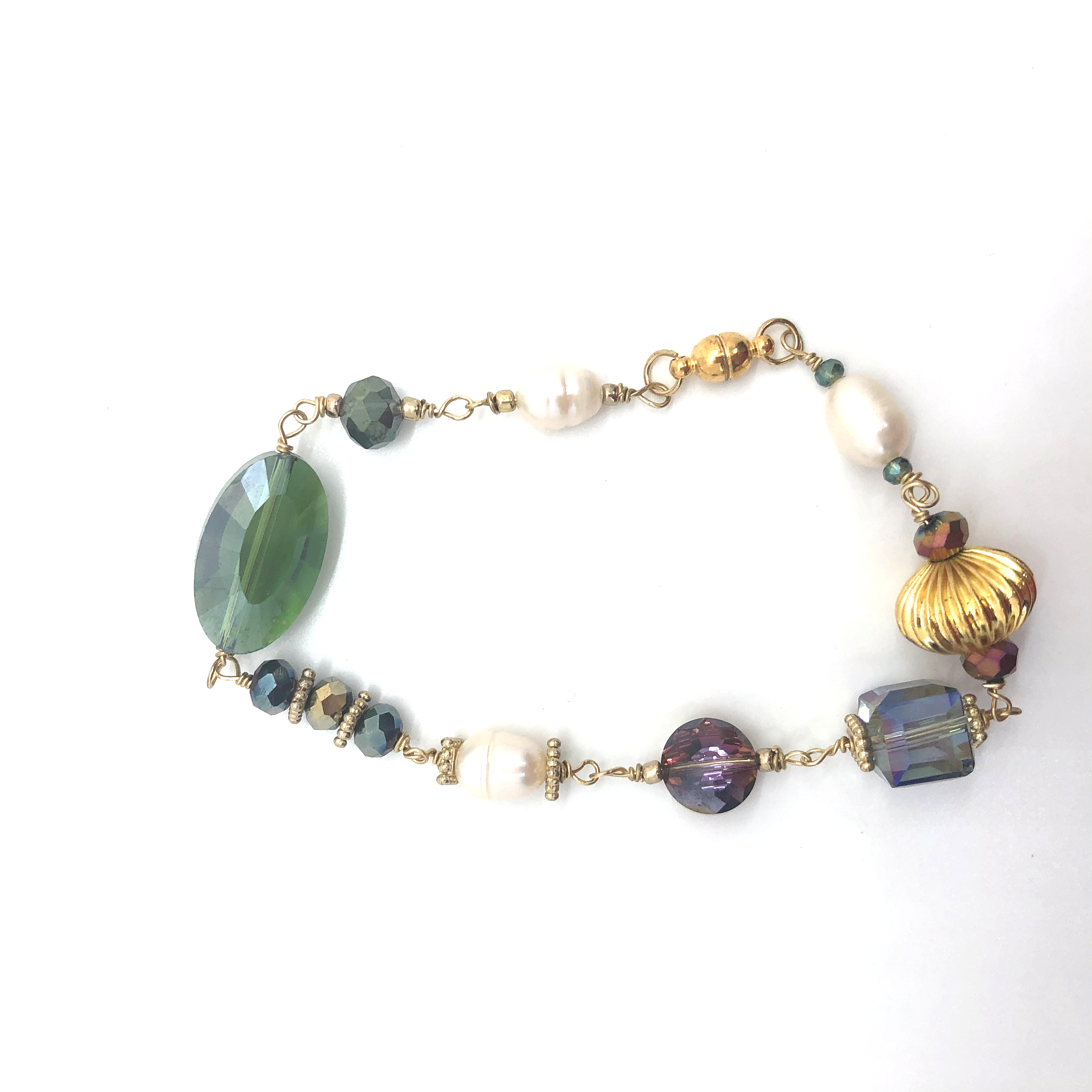 7.5" bracelet features baroque pearls and emerald, blue iris and magenta crystals with a strong magnetic clasp. Great on it's own or stacked with others in the collection or the initial pearl bracelet.