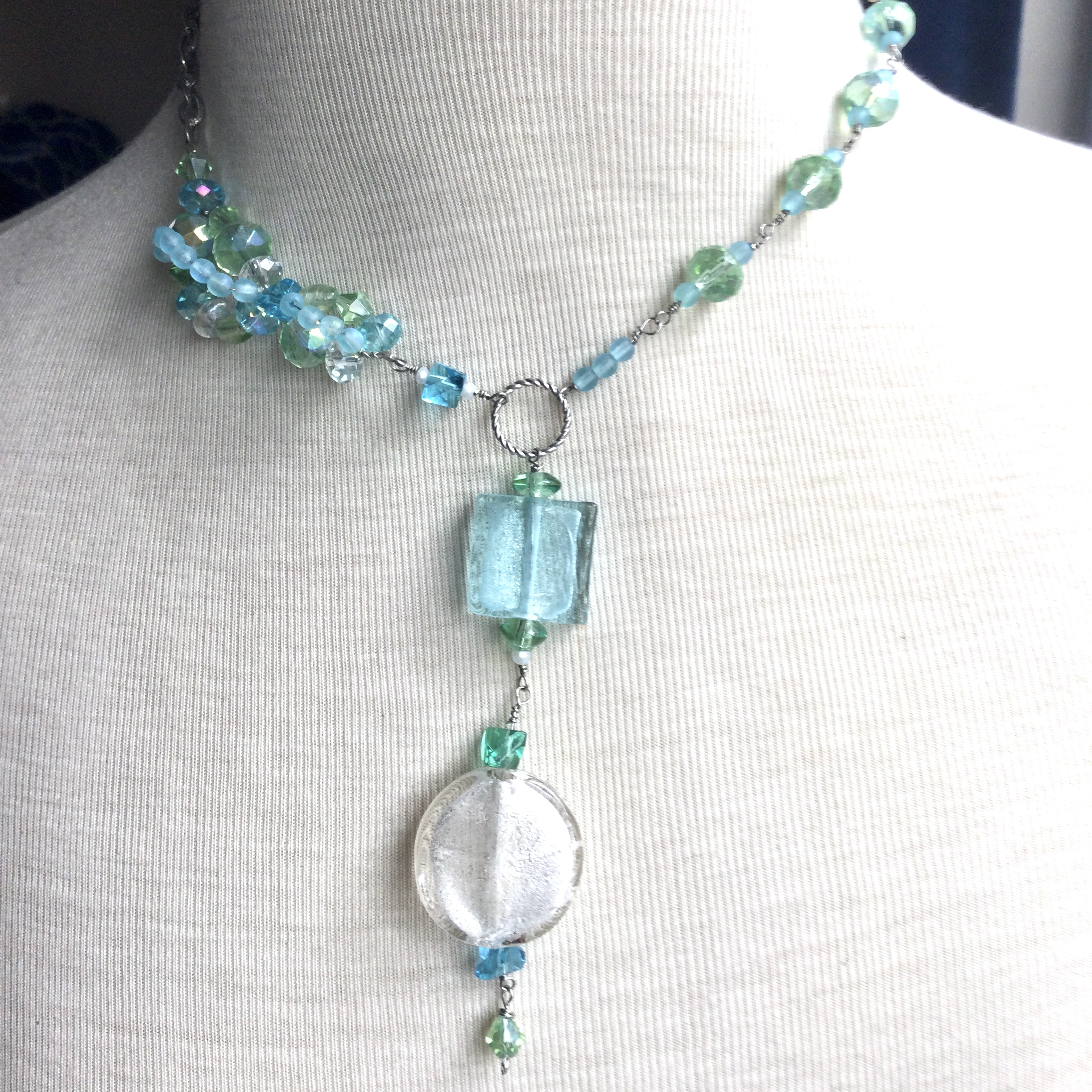 Dimensional Pacific Surf Venetian Glass and Crystal Necklace in Silver Finish