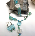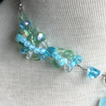 Ride the surf with this fresh, asymmetrical, combination of Venetian glass beads, faceted crystals and mermaid glass beads. One side features hand-wrapped chain links and the other a dimensional beaded wave sculpture. Finished with textured Bali silver chain and a lobster clasp, it is adjustable to 19" and has a...