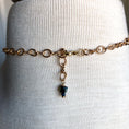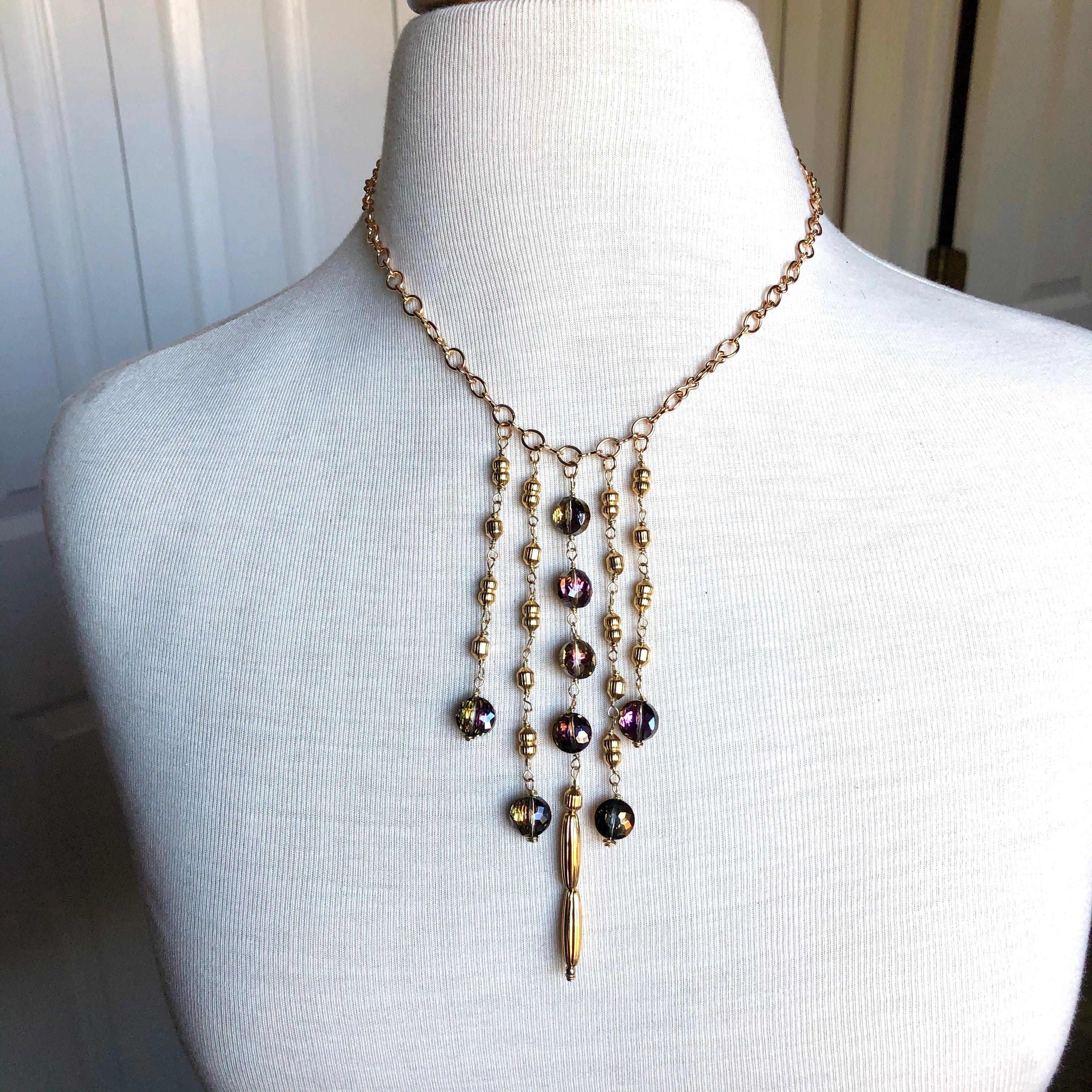 Long stiletto drops of Byzantine gold finish beads and copper metallic luster magenta 1/2 coated coin beads add a stunning focal to the 18" long Byzantine gold filled chain. The longest drop plunges another 5 inches from the chain.