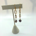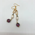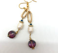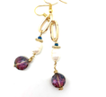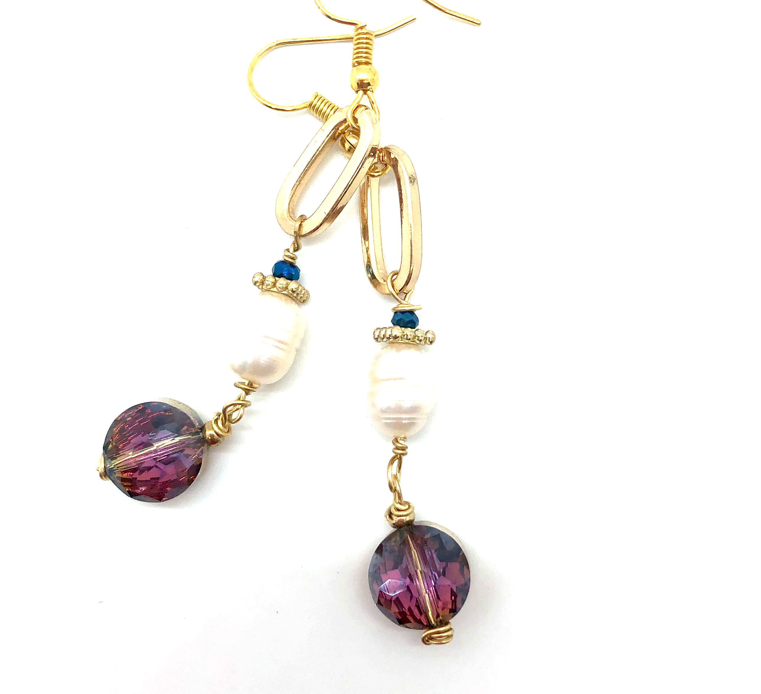A subtle, sophisticated pair of earrings, featuring a 2mm sapphire topping a gold-filled squaredelle, baroque pearl and finished with a copper-lustered magenta coin bead all suspended by a bold 1/2" long gold-filled link. This pair drops 2.5" from the lobe.