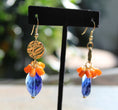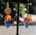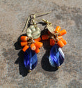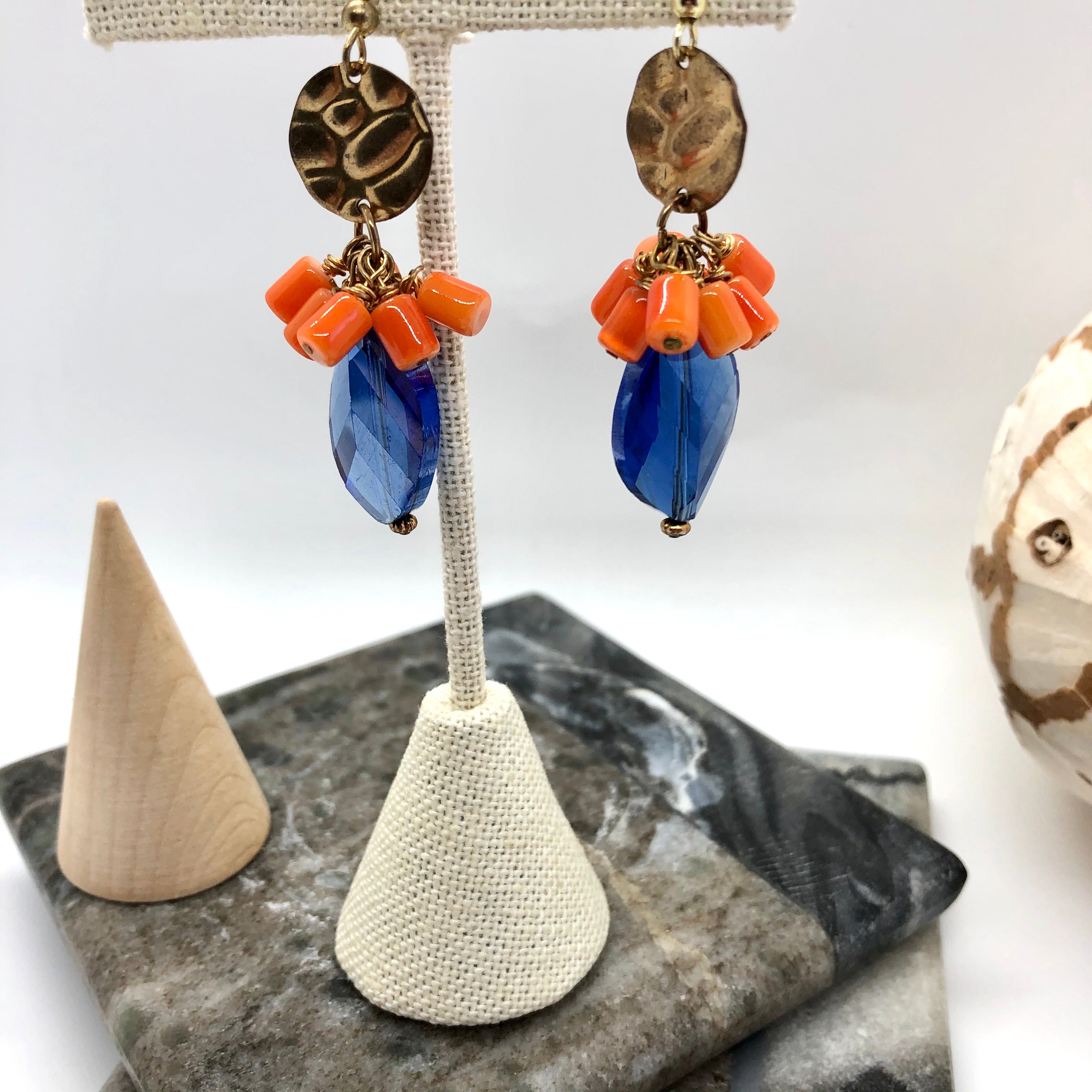 Unique faceted sapphire blue leaf crystals drop from a cluster of tangerine cane glass beads and an antiqued gold filled hammered disc. The versatile color combo works well with a variety of primary and neutral outfits. Earrings measure 2".
