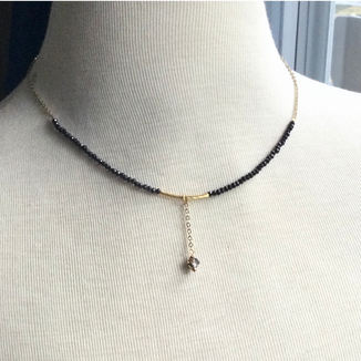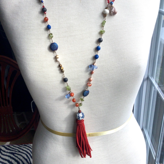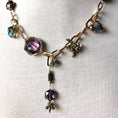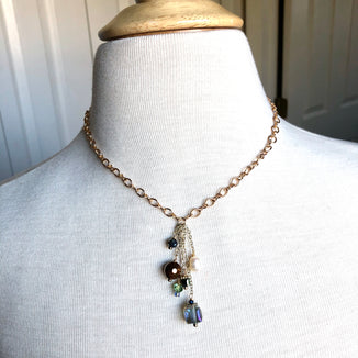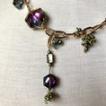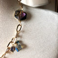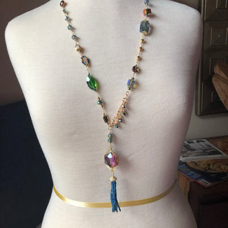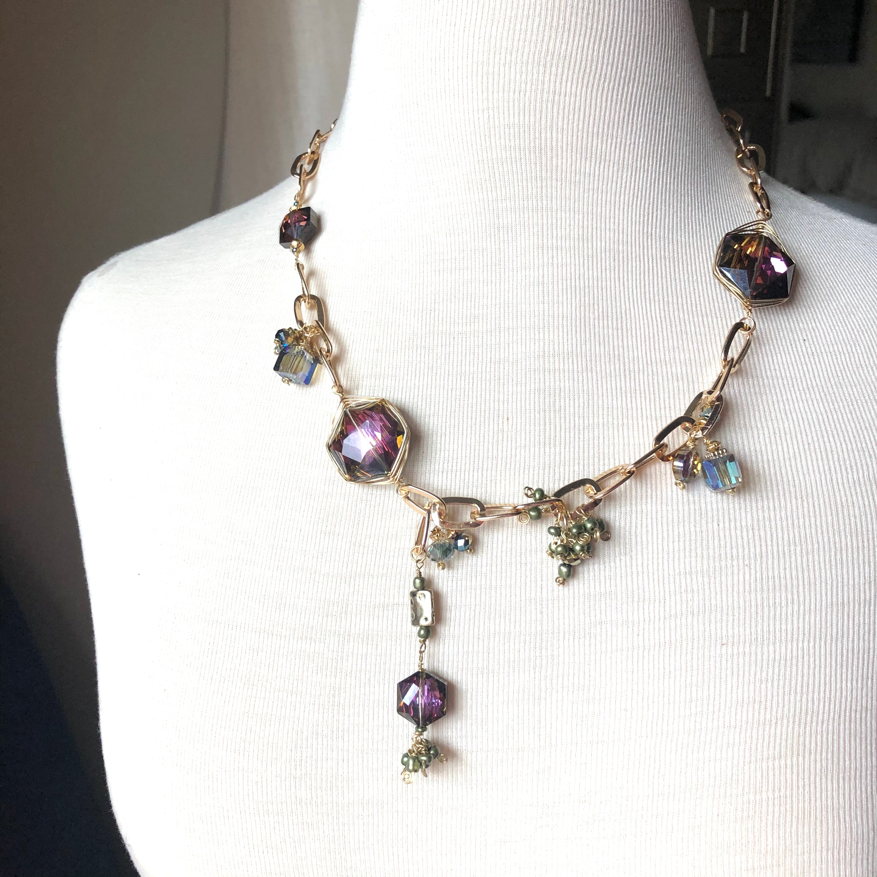 This 16" necklace extends to 24" and features bold cable chain flanked by herringbone-wrapped luster coated magenta hexagon crystals, blue iris coated crystal cubes and baubles of sage green pearlized glass seed beads.