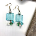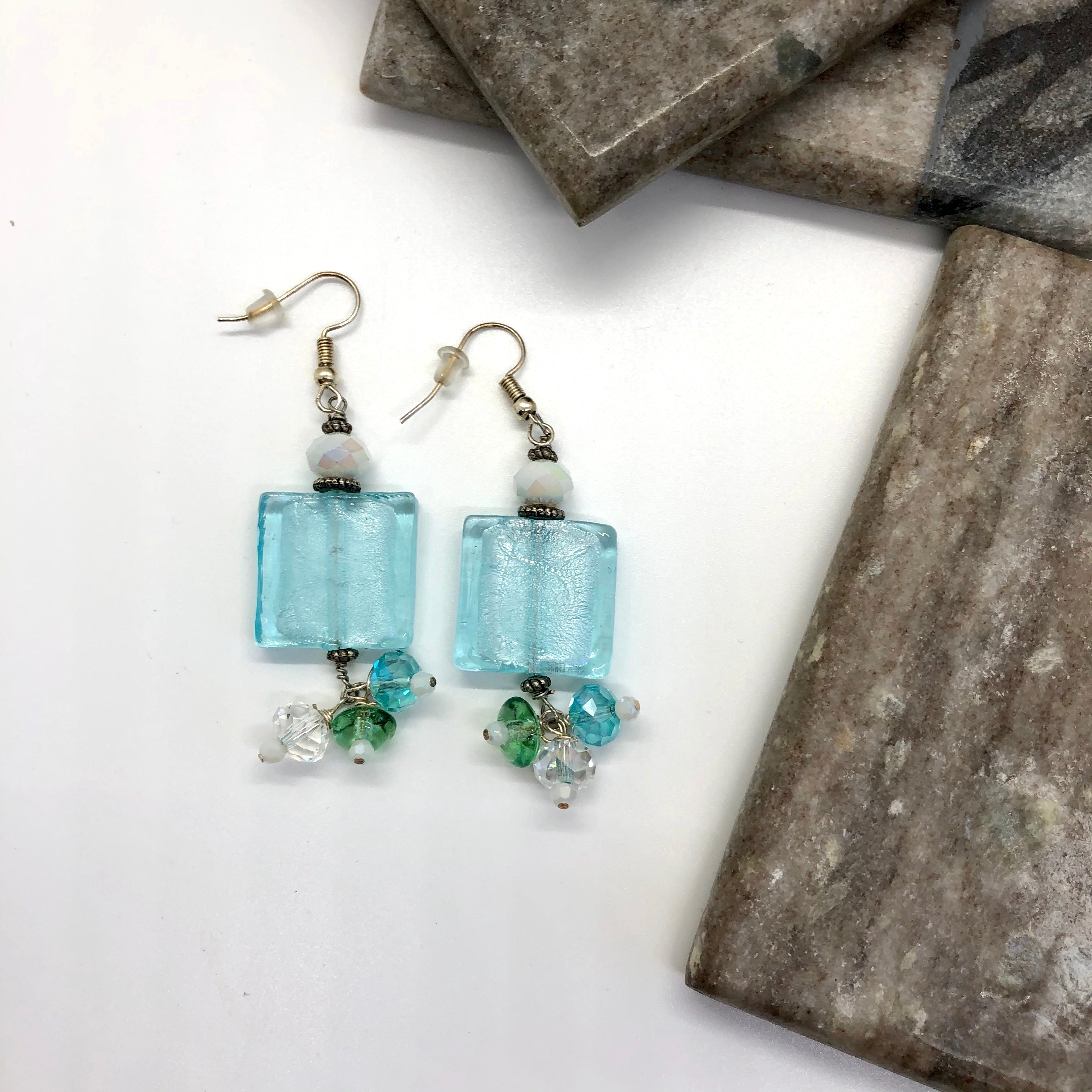 Pacific Surf Square Venetian Glass Earrings with Crystals in Silver Tone