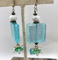 Aqua white opal luster-lined square beads hang from an opaque opal glass rondelle and are finished with a tassel of a trio of glass and crystal beads. This 2.5" pair is a companion to the Pacific Surf Collection necklace and bracelet.
