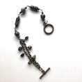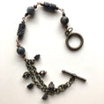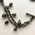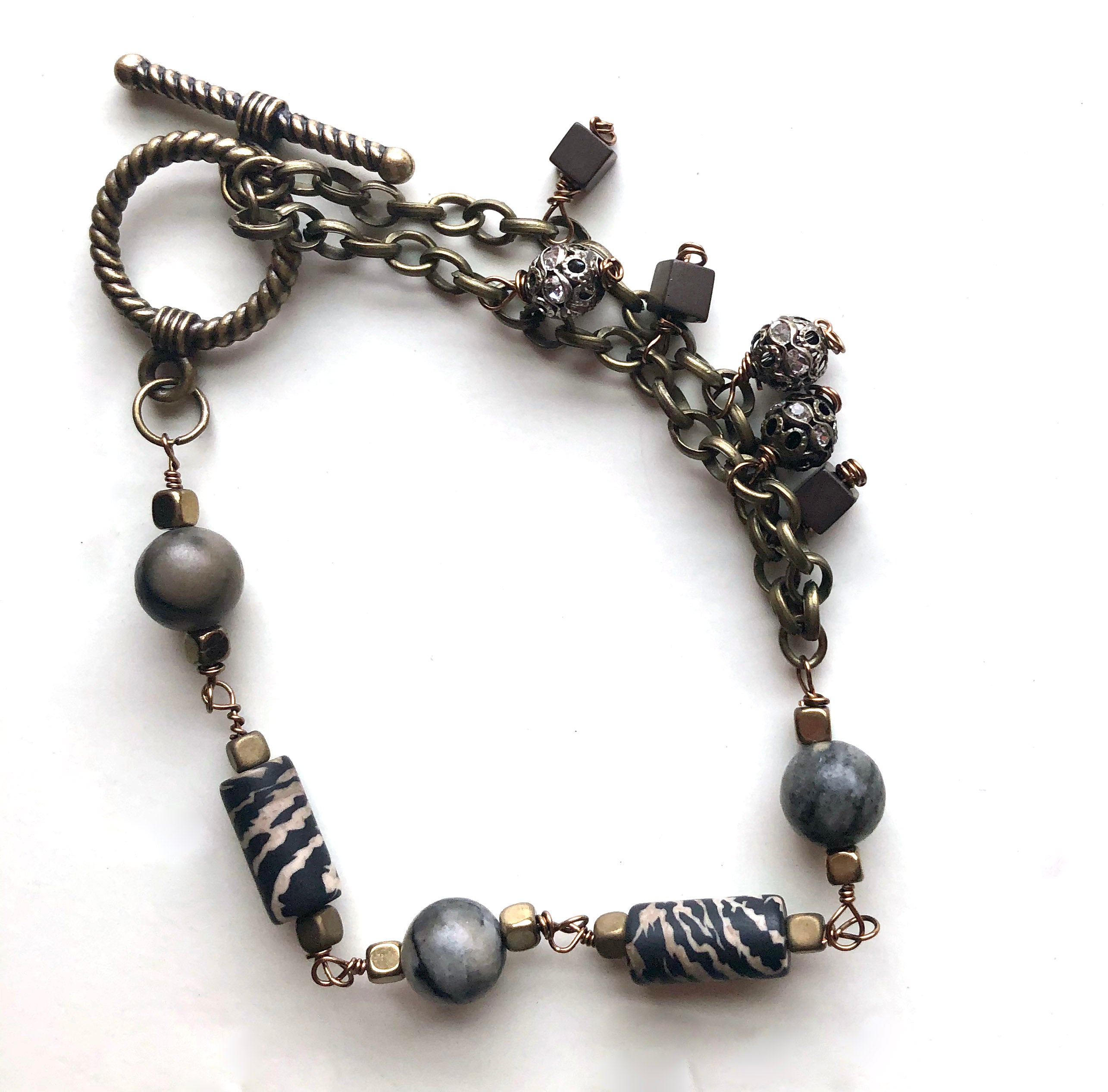 This 8" antique bronze finish toggle bracelet features a handmade chain of clay tiger print beads, Black Matrix Picasso Jasper and tiny bronze cubes connected to a double strand of chain adorned with crystal bronze filigree beads and bronze cube drops.