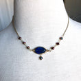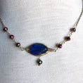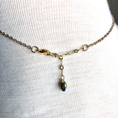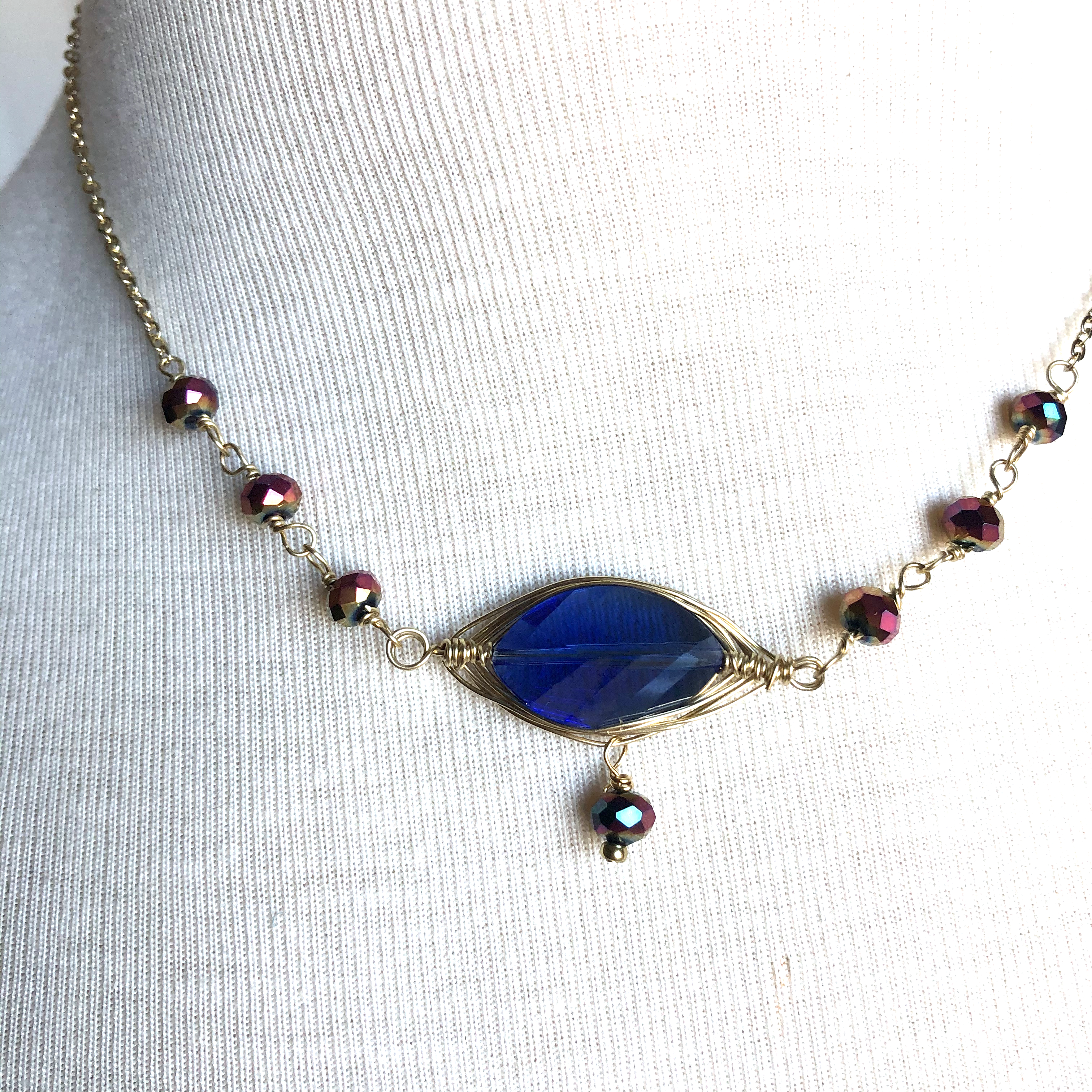 This necklace ranges from 16" to 18" with extender and features a v-faceted, herringbone-wrapped sapphire leaf-shaped crystal and links of 4mm vitreous coated mirror copper crystal rondelles built on a gold filled chain.