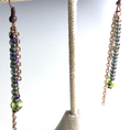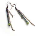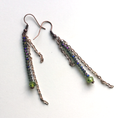 A stack of 2mm crystals capitulated with a metallic peridot Czech glass bead is flanked by 2 strands of rose gold finish chain. They measure 3.5" from the lobe and flatter any hairstyle.