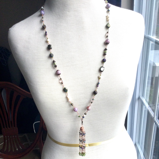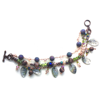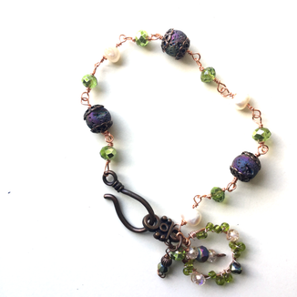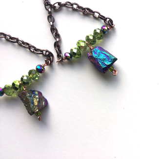 The Biwa Pearls are accented with hand-wrapped rainbow iris coated bi-cone crystals, copper and matte czech beads. This surprisingly lightweight pair of "statement' earrings will drop to 3" at the lowest point when in the ear, and of course comes with silicone clutches for security.